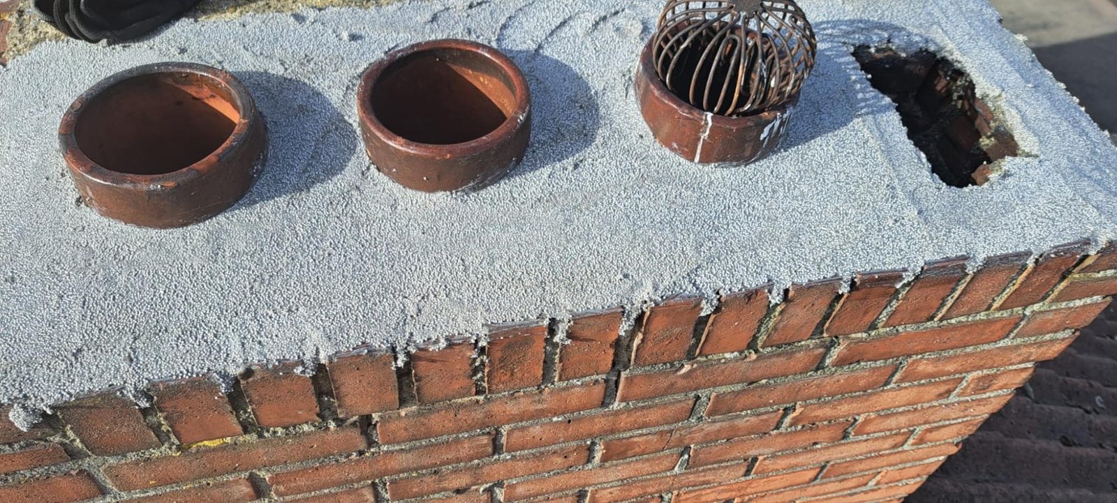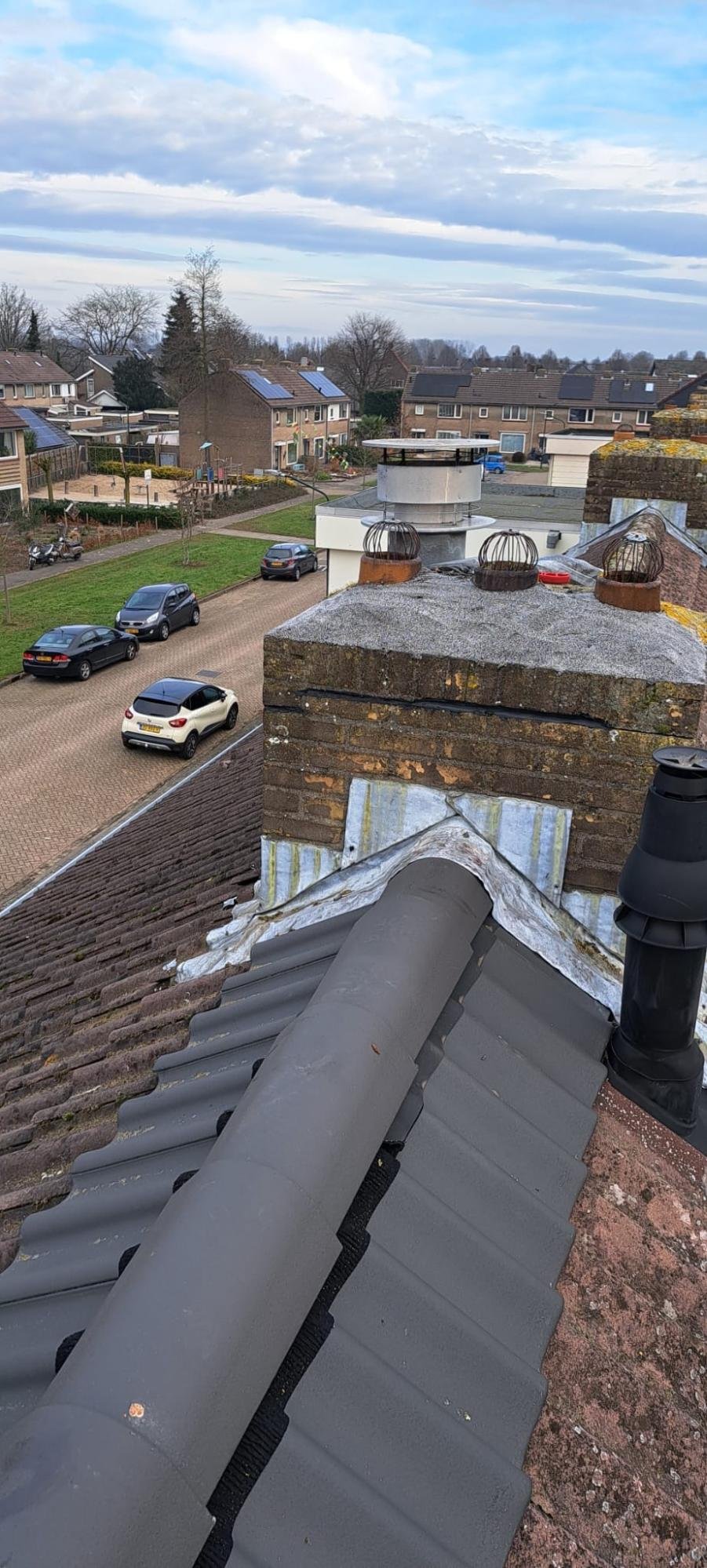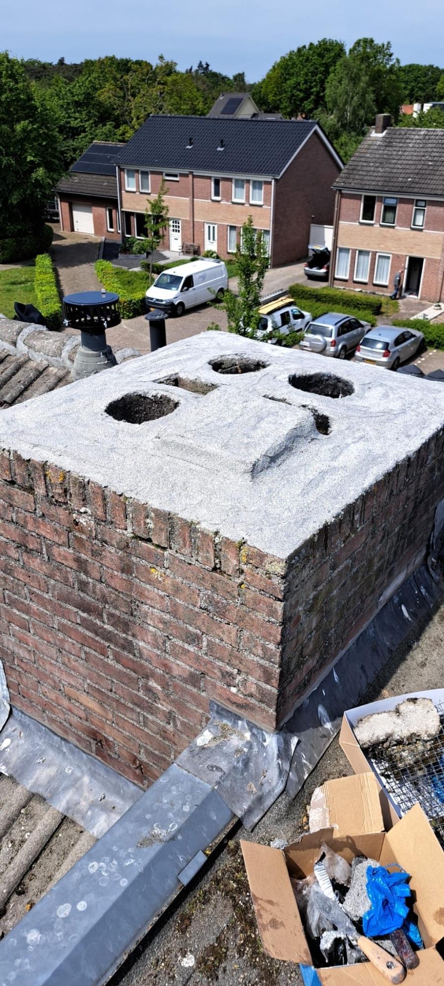 Herstel van scheuren, loszittend metselwerk en lekkages rondom de schoorsteen. Veilig en duurzaam.